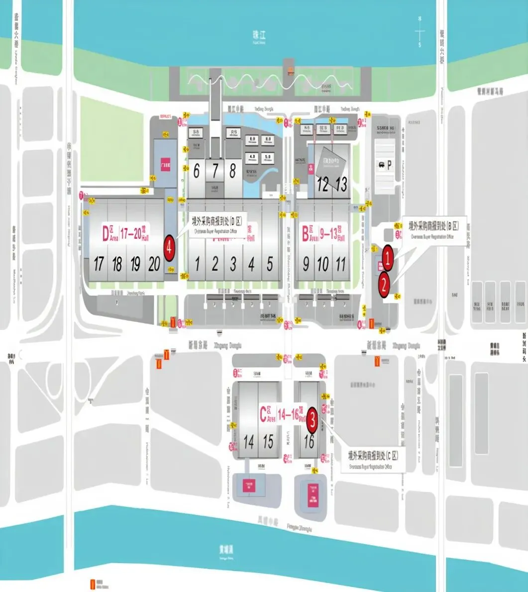 1.上表中标●酒店,4月14日、22日、30日办证时间延长至次日7:00. 2.夜间制证采取先制证,后审核发证的措施。 3.上述办证酒店信息以广交会官网最新发布为准。 二、夜间办证酒店及办证时间 广东亚洲国际大酒店 办证时间:4月14日、22日、30日 21:00-次日7:00 广州东方宾馆 办证时间:4月14日、22日、30日 21:00-次日7:00 广交会展馆境外采购商报到处布局图