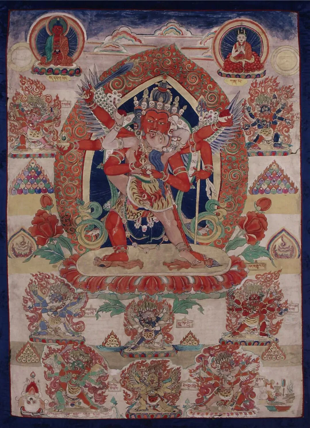 密宗無上瑜伽經典造像,悲智雙融,儀軌嚴謹,細節繁複精巧,盡顯古舊唐卡的宗教底蘊與繪畫匠心。主尊為紅色身雙身本尊,多面多臂,擁抱明妃,是藏傳佛教密宗無上瑜伽部的重要本尊,象徵「悲智合一」。
