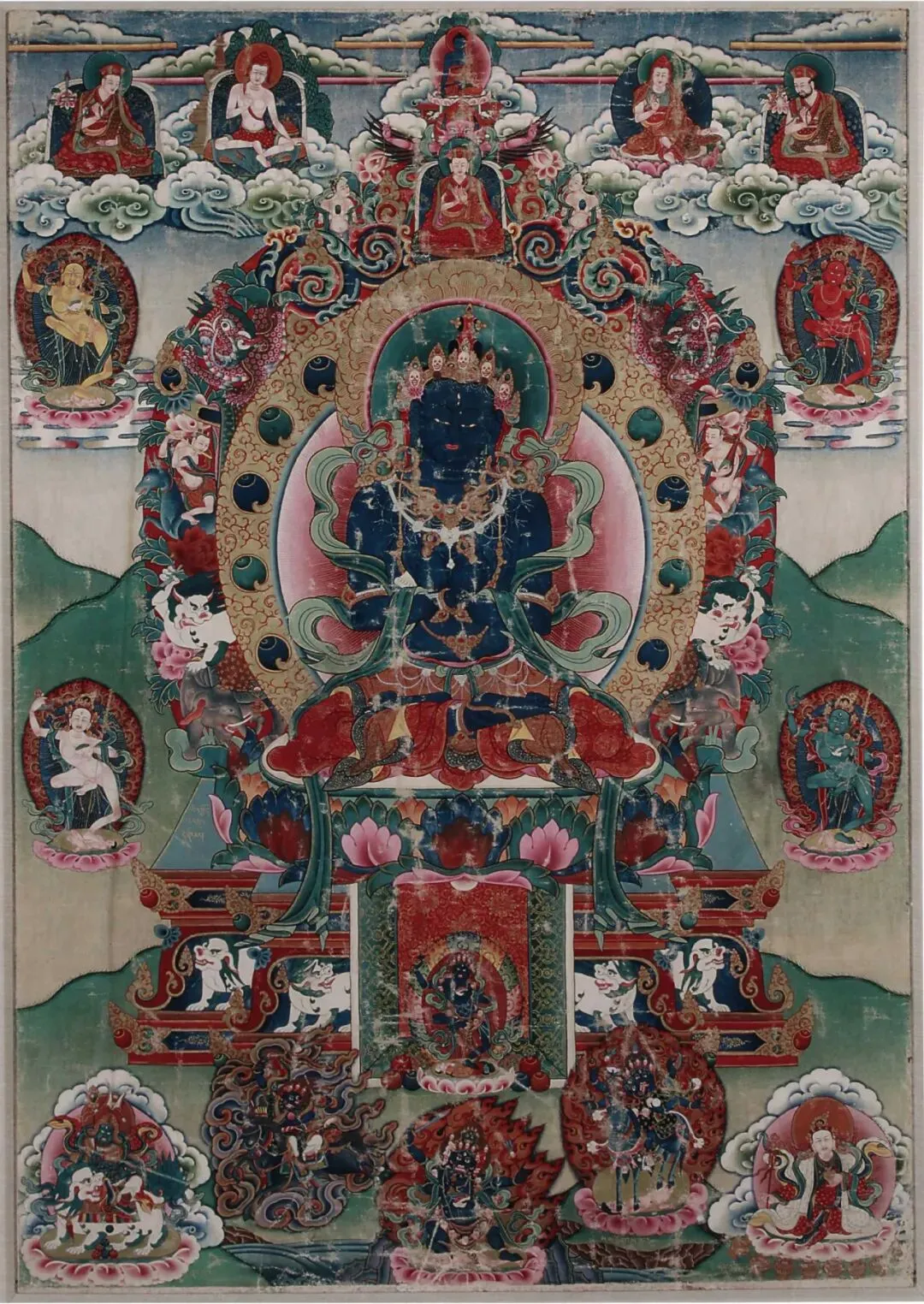 主尊為獅面空行母,獅首人身,獅首威嚴,身姿靈動,下方三尊為同類護法(象面、熊面等空行母),是藏傳佛教寧瑪派、噶舉派賞見的護法題材。