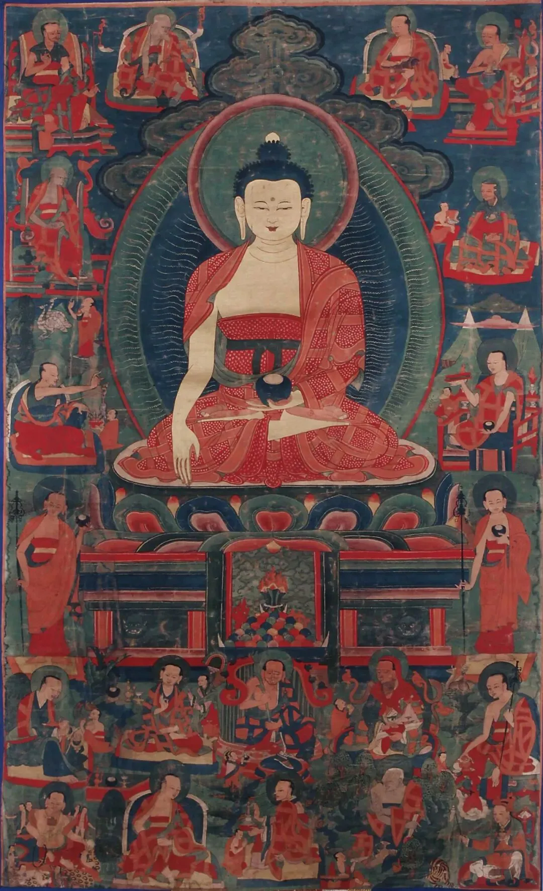 主尊釋迦牟尼佛結觸地印,周圍十八羅漢伴、弟子及護法,是藏漢融合風格的經典題材。