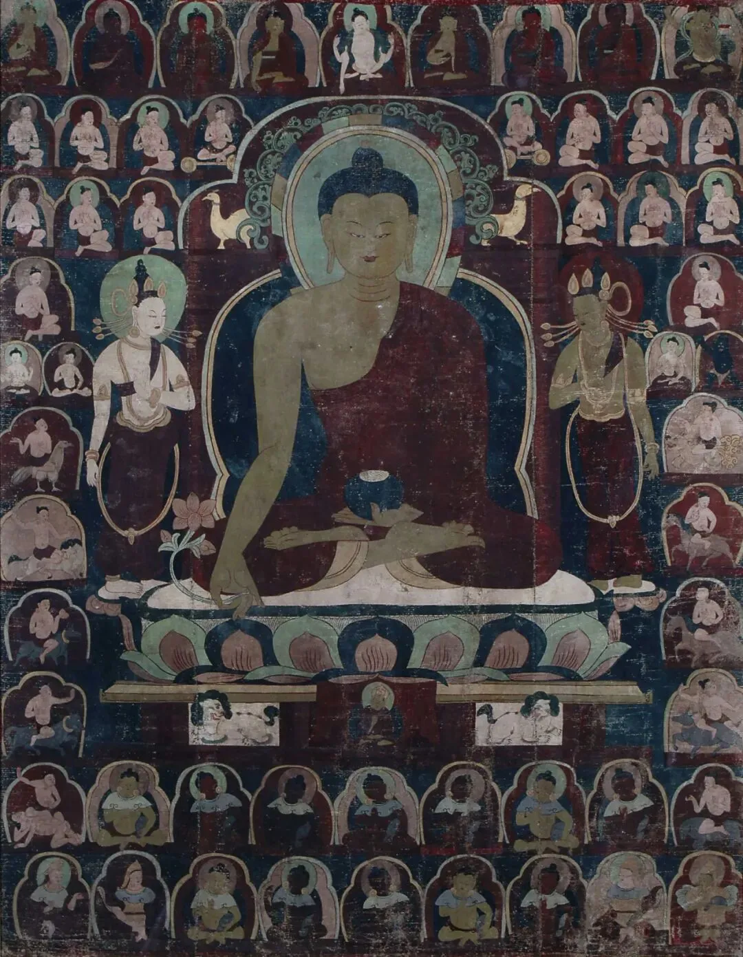 主尊釋迦牟尼佛(藥師佛)結觸地印,周圍環繞千佛,脅侍菩薩,寓意「萬佛朝宗」是清代藏地流行的題材。