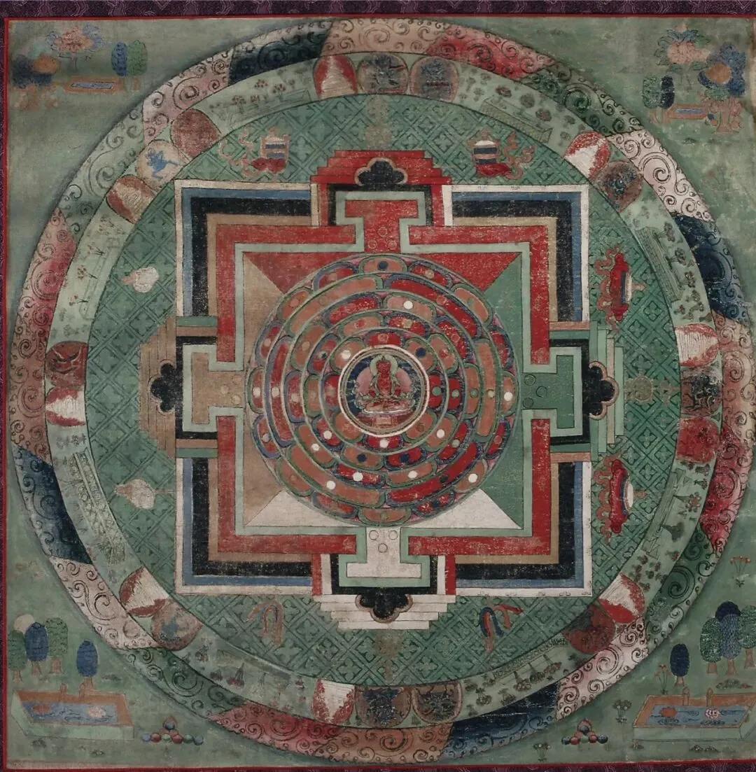 典型的藏傳佛教壇城(曼荼羅),以極致對稱幾何構圖勾勒佛國宇宙,壇城規整,本尊居中,咒輪環繞,色彩沉穩厚重,是密宗觀修核心珍器,極具藝術與修行價值。