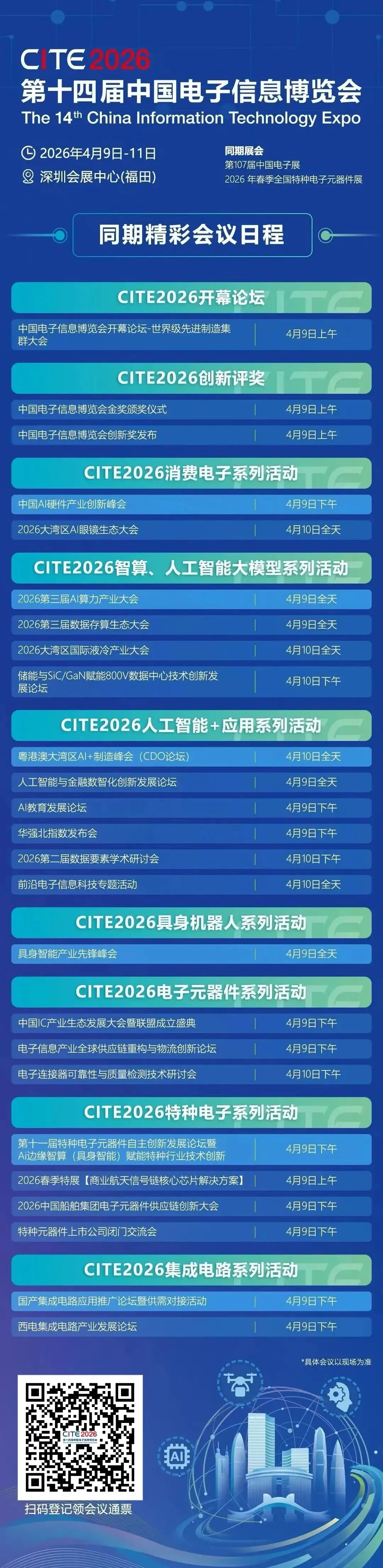 2026年4月9日至11日,深圳会展中心(福田),第十四届中国电子信息博览会(CITE2026)诚挚邀请全球业界同仁莅临,在AI浪潮,共同见证新技术、体验新产品、探索新场景。