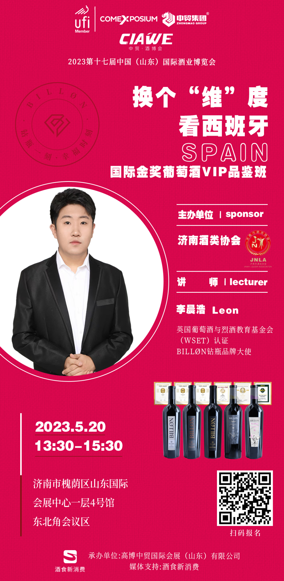 5月20日下午,在第十七届山东酒博会现场,由济南酒类协会主办,高博中贸国际会展(山东)有限公司承办,酒食新消费支持的 “换个‘维’度看西班牙-SPAIN国际金奖葡萄酒VIP品鉴班”将精彩举办,带大家领略西班牙葡萄酒的优秀品质。