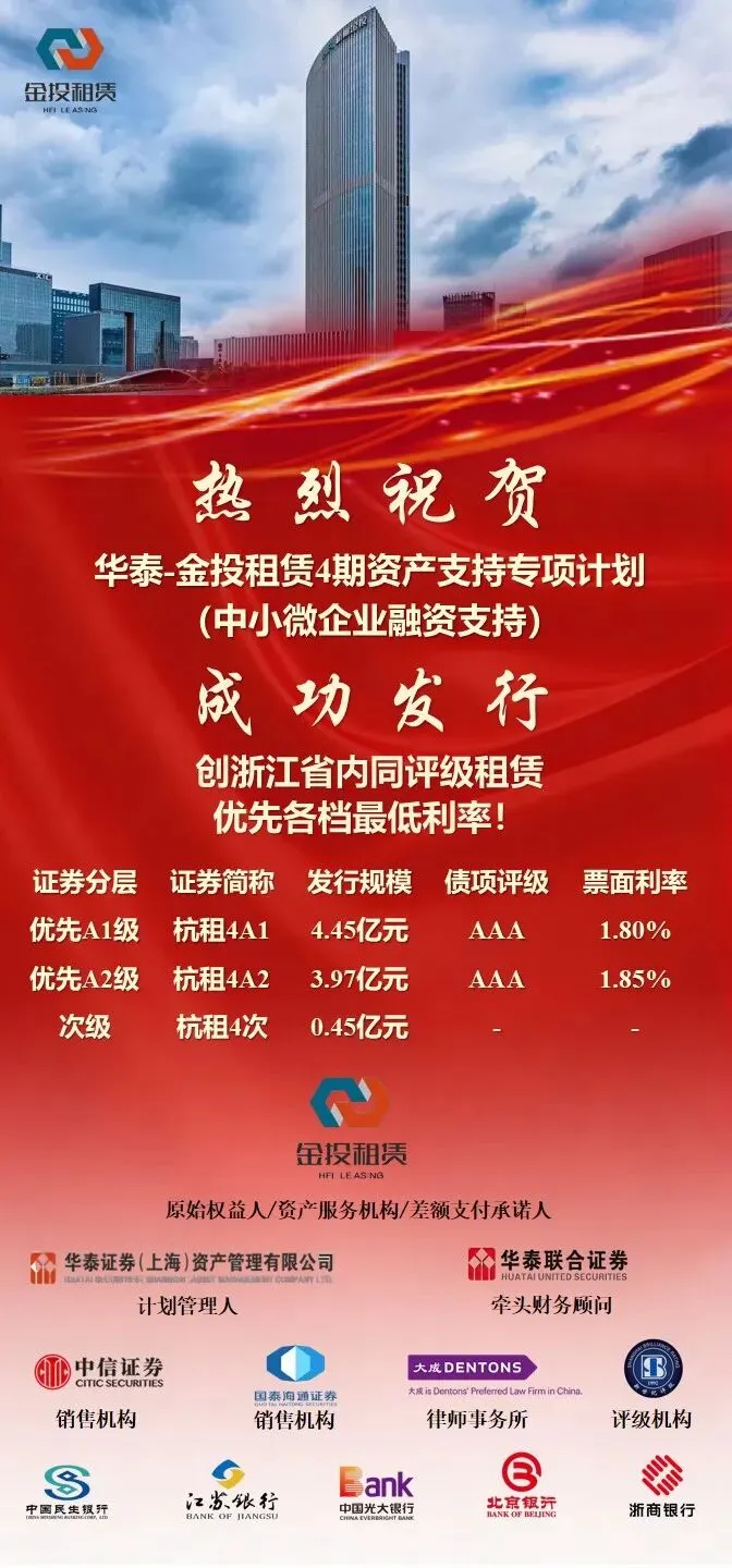 近日,杭州金投旗下金投租赁8.87亿元“中小微企业融资支持”ABS成功发行。本期产品分为三档:优先A1档4.45亿元,发行利率1.80%;优先A2档3.97亿元,发行利率1.85%;次级0.45亿元,公司自持。