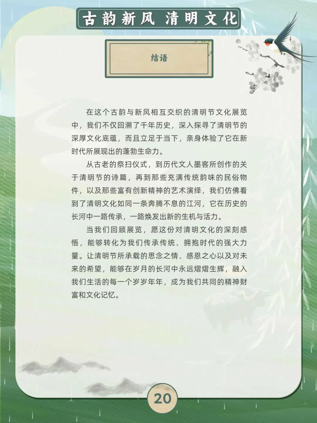 “古韵新风清明文化展览”展现了清明节千年历史与现代活力。以“古韵新风”为主题,既尊崇传统,又追求创新,让清明文化在新时代焕发新光彩。该展览不仅是对清明文化的深入挖掘和展示,也是传承与创新的实践。它让我们在缅怀先人时,感受到传统文化的魅力,激励我们在新时代传承和弘扬清明文化,使古老传统在新时代背景下更加绚烂。