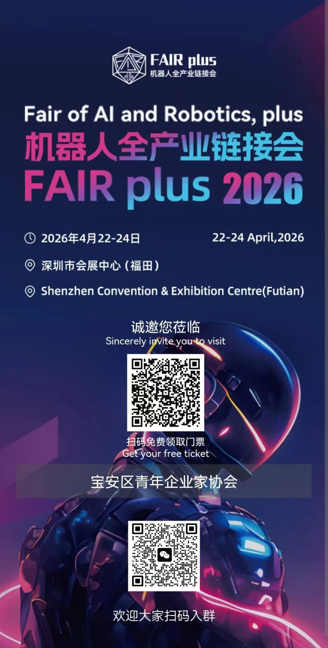 2026年4月22日-24日,FAIR plus机器人全产业链接会将在深圳会展中心(福田)隆重启幕。FAIR plus2026定位于“世界级机器人开发制造技术大会”,是一个专注于机器人全产业链技术和开发资源的平台。通过学术会议、技术标准、社区培育、供需对接等方式,创造人工智能+机器人各产业链环节的开发、产品、工程、方案等技术人员,以及有意引入机器人的场景方相关工艺、设备、信息技术人员线下见面的机会,达成合作,以有效促进机器人向智能化方向发展,连同提升产业整体能力的建设和配置。