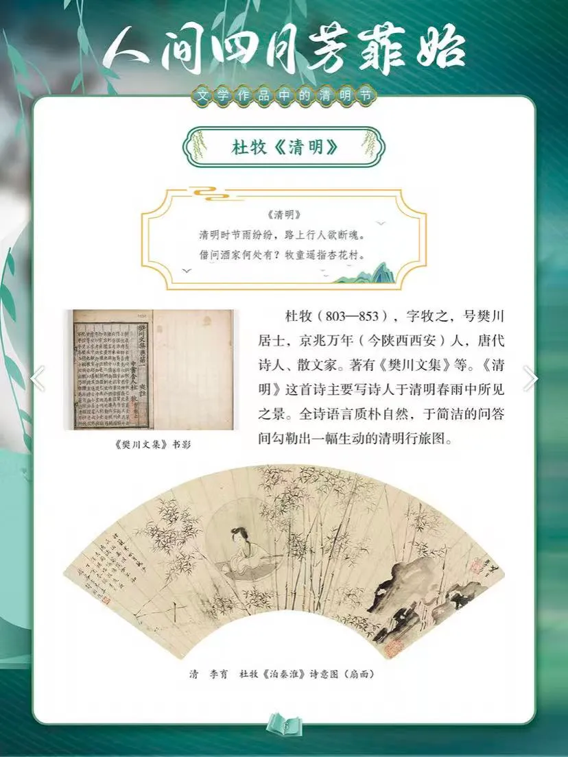 清明节,又称“踏青节”“行清节”“三月节”等。清明既是时序轮转中的重要节气,也是承载着厚重情思的传统节日。草木萌动,万物洁净,清明仿若一场盛大的邀约,引得古往今来的文人墨客纷纷挥毫泼墨。在诗词的平仄间,在文字的描摹里,清明节被赋予了丰饶的文化意蕴与深沉的情感张力,成了追忆往昔、遥寄情思的精神纽带,其间既有春日踏青的逸兴遄飞,也不乏祭祀追思的肃穆凝重。从古代诗人杜牧的《清明》,到当代作家陈忠实的《白鹿原》,无数文人墨客用他们的文字描绘了一个个动人的清明节场景,这些文字不仅镌刻着历史的记忆,而且传递着深厚的文化内涵与情感共鸣。