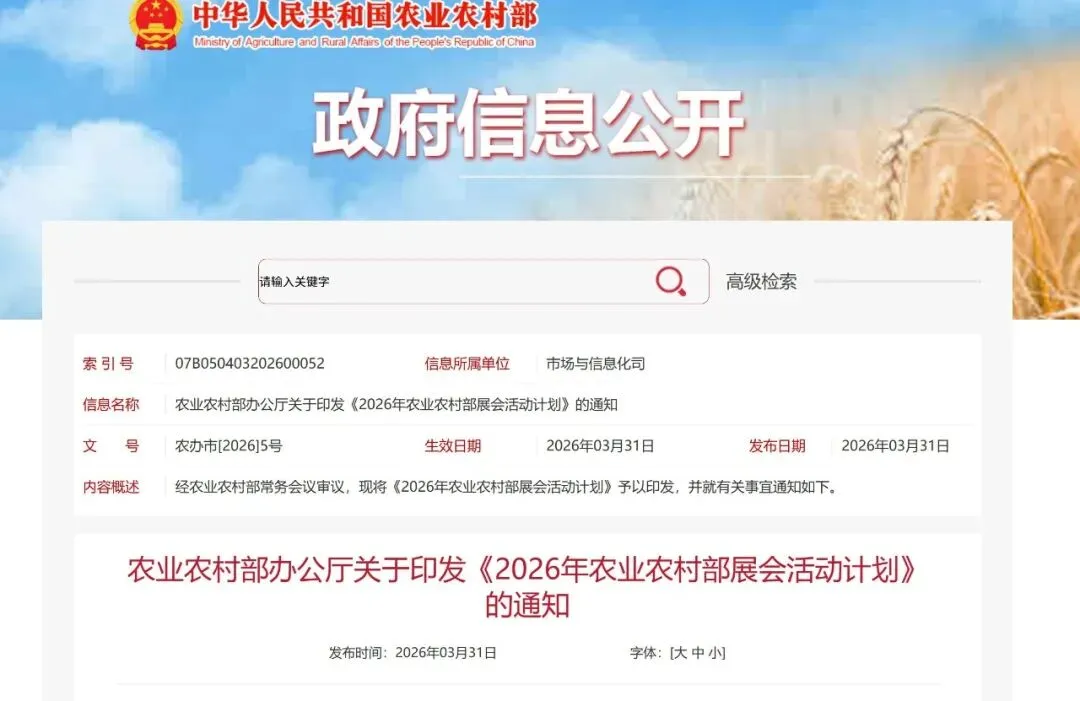 2026 年作为十五五开局之年,农业农村部展会活动迎来新部署!3 月 31 日,农业农村部办公厅印发《2026 年农业农村部展会活动计划》(农办市 [2026] 5 号),明确五大核心方向:聚焦乡村振兴中心工作,坚持市场化、专业化、国际化、品牌化、信息化办展,突出促进消费主题,设置促消费专区与农文旅融合沉浸式体验,严格规范办展,务实节约,严禁嵌套无关活动。