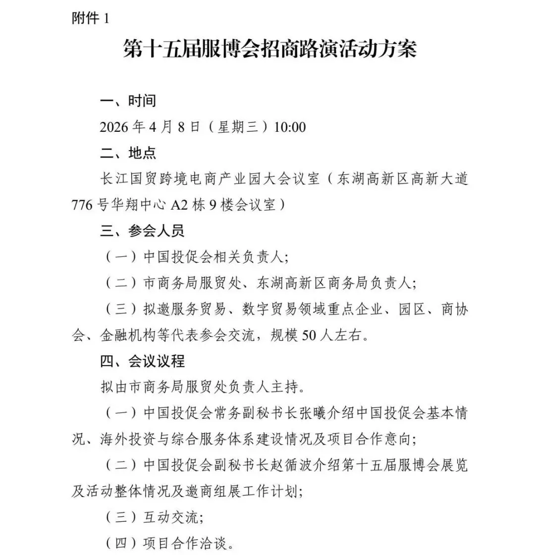 为帮助各方用好本届服博会活动平台,加强服务贸易、数字贸易及服务外包资源对接,市商务局、中国投促会拟于2026年4月8日(星期三)10:00在东湖高新区长江国贸跨境电商产业园举办第十五届服博会招商路演活动。如有参会意向,请将参会回执反馈至whfwmy2020@126.com。