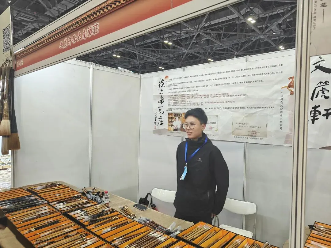 展会现场,文港青年制笔人才风采尽显。徐逸篪(1998年出生)作为南昌市市级非遗代表性传承人,是文港制笔界的新锐青年力量,曾在全国轻工行业职业技能竞赛毛笔制作工赛项中斩获单人赛一等奖,更跻身该赛项决赛第五名,以硬核技艺成为青年一代传承古法制笔工艺的典范。