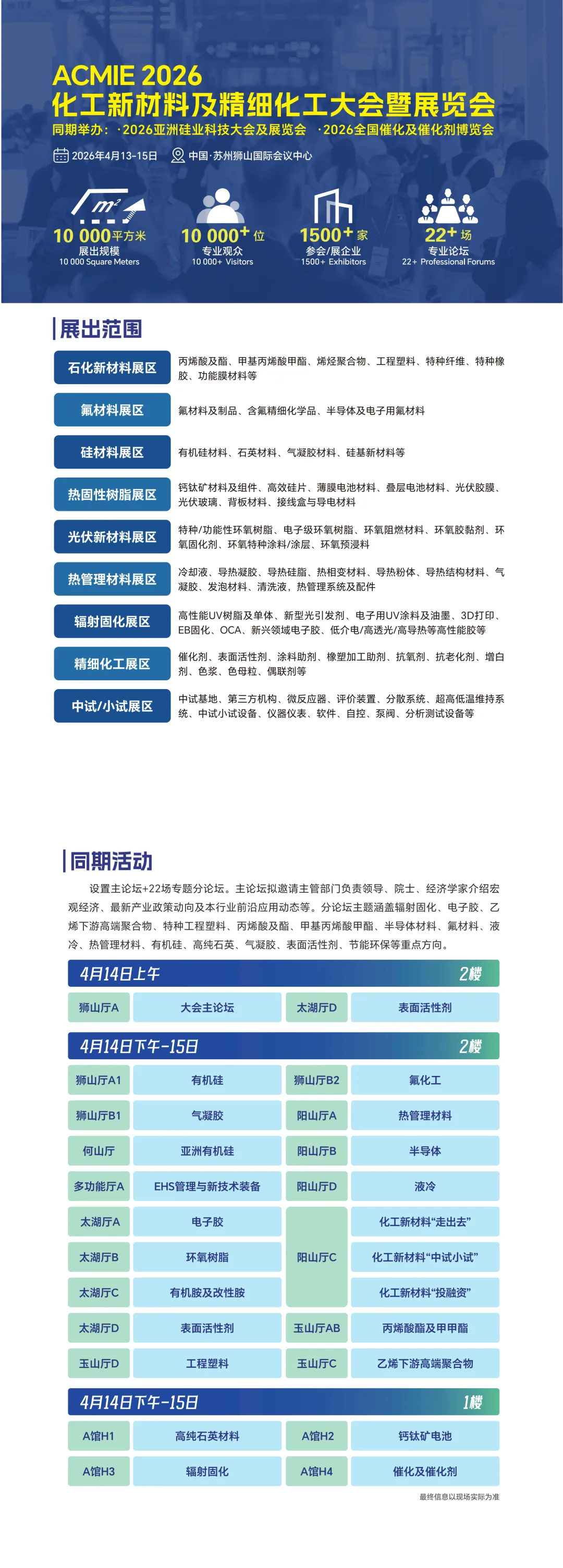 同期举办2026化工新材料及精细化工大会暨展览会(ACMIE2026),共设20场专题研讨会,涵盖液冷、热管理材料、有机硅、氟材料、半导体材料、环氧树脂、固化剂、辐射固化、高纯石英、气凝胶、特种工程塑料、表面活性剂、特种纤维、胶粘剂、高端烯烃聚合物、甲基丙烯酸甲酯等重点方向。预计参会规模3000人,参加企业1500家、展示面积1万平米,一票通用。