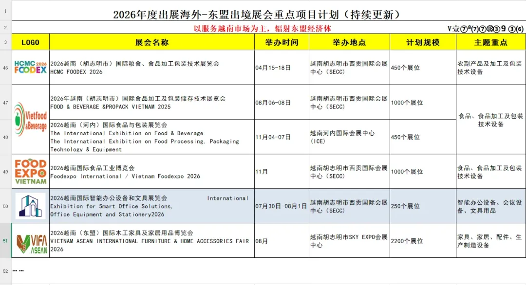 | 越南食品加工与包装展(Vietfood & ProPack) | | 约1000家展商、3.9万观众,双展并行,完整覆盖食品产业链 |