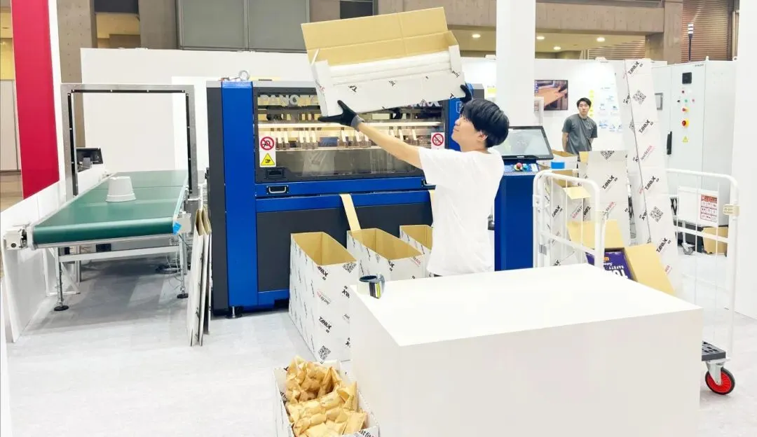 除了上述产业,其他如载具、包装以及货代行业的企业也纷纷展出,并且部分企业利用自身产品特性设置了一些颇有趣味的小游戏,增强了与观众的互动性。其中,值得关注的是一家名为TANAX的企业,该企业主要提供包装设备和解决方案,其在本届展会上展示的名为MIDI的产品,能够根据被包装产品的外观和大小对包材(瓦楞纸)进行裁切和折叠,并且为易碎品预留了缓冲包材的空间,该解决方案能够大幅降低包材的使用率,从而在成本和环境保护方面创造不小的价值。