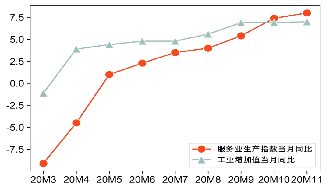 四季度服务业修复进度加快。四季度以来,随着国内疫情进入常态化防控,居民的生产生活秩序持续恢复,服务业的发展也出现了明显改善。从服务业生产指数看,10月和11月服务业生产指数同比增速快速回升至7.4%和8%,较三季度平均4.3%的增速大幅提升,恢复速度快于工业。服务业快速恢复主要得益于国内疫情防控取得积极成效,居民出行、购物、旅游等生活需要得以保障。经济快速恢复和服务业企业经营模式创新也推动了服务业快速发展。