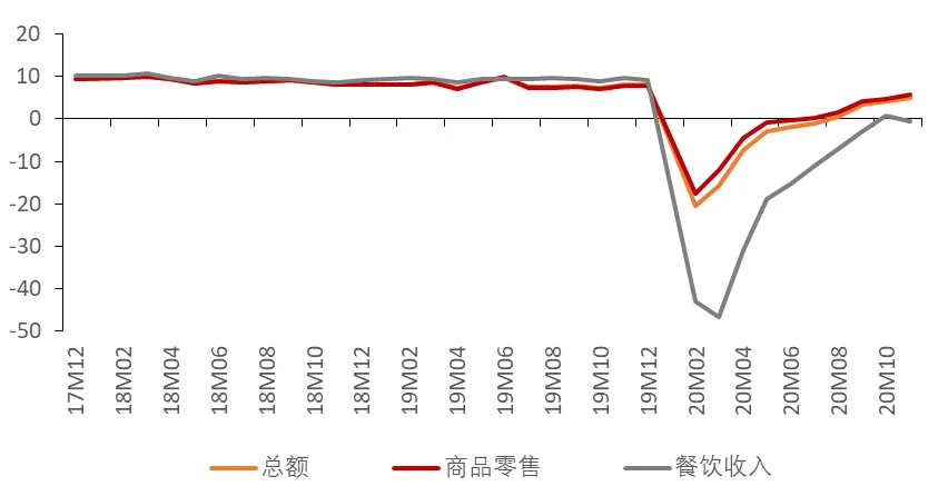 在一季度我国疫情基本控制后,消费持续平稳复苏,8月份社会消费品零售总额同比增速转正,四季度继续快速恢复。社会消费品零售总额10月增速为4.3%,11月升至5.0%,但恢复速度仍落后于投资和出口,且较2019年全年8%左右的增长水平仍有一定差距。从结构上来看,商品消费恢复得较好,而餐饮消费的复苏仍显缓慢。商品消费方面,11月同比增速已恢复至5.8%,其中通讯器材、化妆品、金银珠宝、药品、烟酒和办公用品的消费都受到“双十一”购物节的明显提振,实现了两位数的增长;此外,汽车消费也取得了两位数的增长。地产相关的建材、家电、家具消费也都延续了温和复苏表现。餐饮消费方面,10月同比增速已经转正为0.8%,但11月又回落至-0.6%,局部地区疫情反复是拖累其再次跌落至负增长区间的原因。