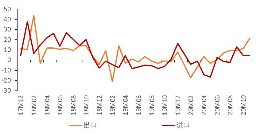 二季度以来,出口一直维持了强劲表现。10月美元计价出口同比增速为11.4%,11月大幅升至21.0%,创2018年2月以来的最高增速。亮眼的数据背后至少有三方面原因:第一,国外生产恢复对我国产品的需求大幅增加。第二,由于欧美国家推出的财政救济措施主要用于补贴家庭部门,其消费先于生产复苏。第三,海外疫情加剧,防疫物资出口再度反弹。我们判断明年出口前景仍然乐观。虽然海外新冠疫情形势依然严峻,但全球经济已经开始走出低谷,逐步复苏。展望2021年,在疫情死亡率下降,各国应对经验更加成熟的情形下,全球经济将继续维持复苏态势。如果针对新冠病毒的有效疫苗或特效药研发成功,那么全球经济还可以在短期内快速恢复。经调研了解到,对于欧美买家,即使加上惩罚性关税,中国产品的性价比依然超过其他国家同类产品。出口明年在外需继续好转的情形下有望延续增长趋势。