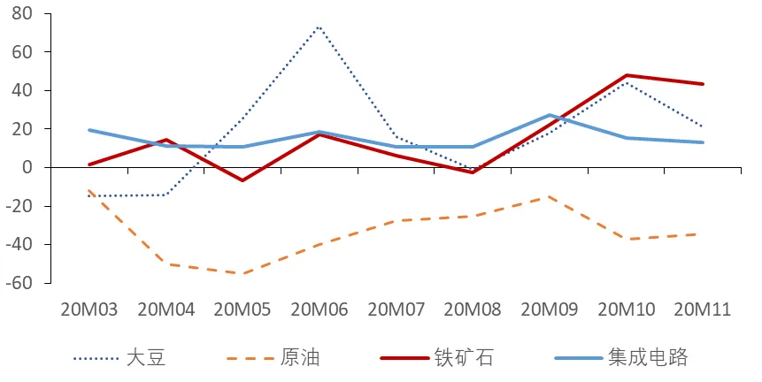 受内外需均好转驱动,进口也快速增长。以美元计,10月和11月进口同比增长率分别为4.7%和4.5%。大宗商品方面,国内工业生产迅速恢复,需求旺盛,铁矿石进口增速大幅升至43.4%,并带动价格不断走高;大豆进口仍维持在24.8%的增速,显示出中国正稳步履行中美第一阶段经贸协议。高度依赖进口的集成电路产品,其进口增速继续保持着两位数的高增长,主要受益于电子产品市场需求扩大以及厂商积极采购。随着明年国内经济回暖反弹,进口仍将保持平稳增长。