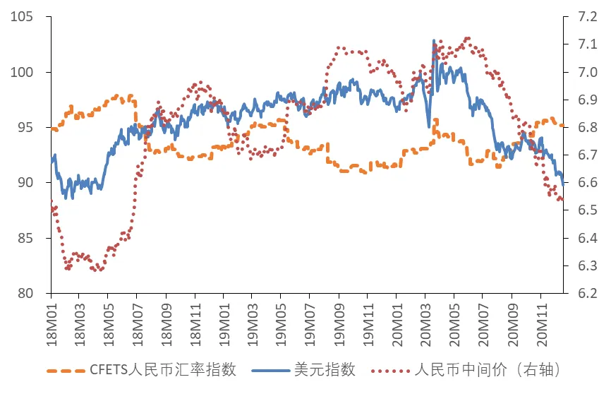 汇率方面,人民币在今年下半年开始进入升值周期,自6月末的7.10左右持续升值至当前的6.50-6.60区间。人民币快速升值,主要原因在于美国财政赤字快速扩张与美联储大幅宽松的货币政策使美元指数不断走弱;另外,出口强势反弹,经常项目顺差扩大,货币政策率先正常化也助推了人民币的升值。