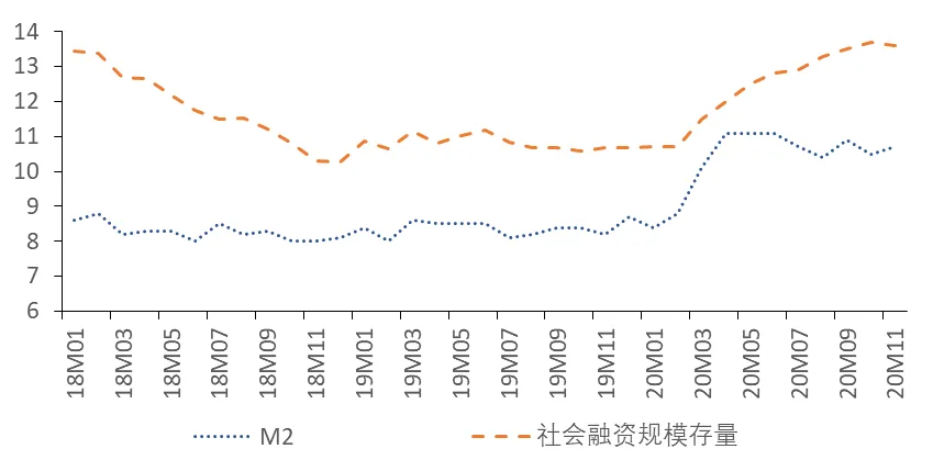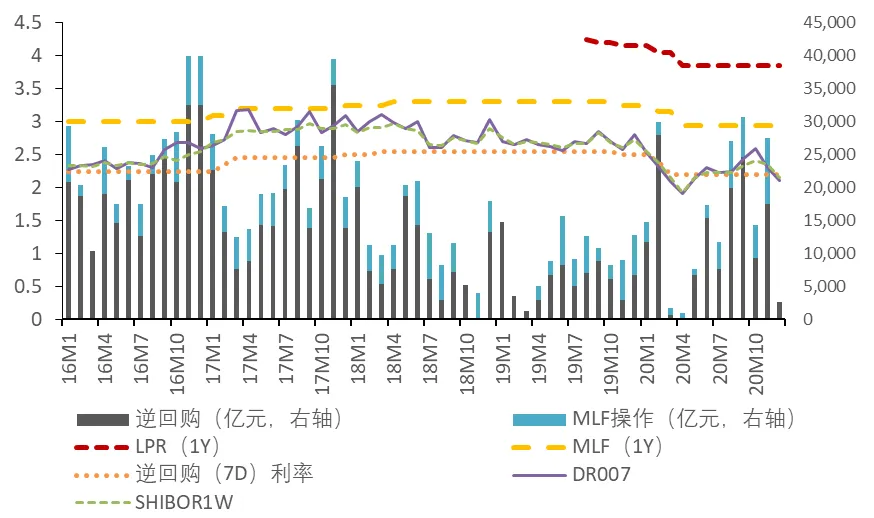 今年在疫情发生后,央行采用了一系列逆周期调节措施支持实体经济,既包括数量型工具,增加逆回购和MLF操作、降准、再贷款再贴现,也包括价格型工具,引导LPR利率下调。随着经济迅速反弹,降息的必要性下降,所以在4月之后MLF操作利率一直维持在2.95%未变,近期我们更多的看到央行通过数量型工具投放流动性,稳定市场预期。2021年货币政策仍将延续下半年以来稳健中性的取向,在防范风险的前提下,逐步回归与经济增长相匹配的轨道。