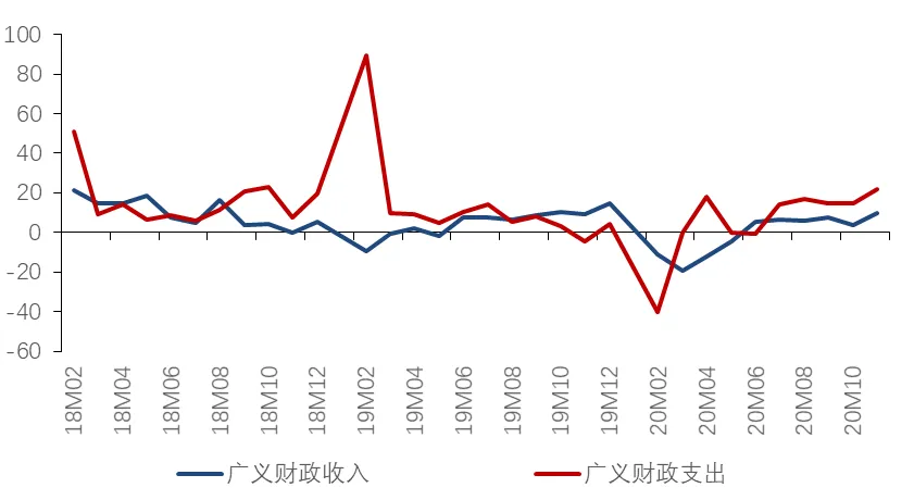 财政政策方面,下半年来广义财政收入(一般公共收入+政府基金性收入)状况稳步改善,11月全国广义财政收入当月同比增加9.6%,这主要受益于政府性基金收入快速增长,11月当月同比增速为27.3%。广义财政支出(一般公共支出+政府基金性支出)在下半年后一直维持着两位数的较高增速,11月增速达到了22.1%。财政支出高增长的背后是今年财政发挥逆周期调节作用,以抵消疫情的负面影响,比如一般公共预算大幅增加了对“六保”支出等。随着经济回暖,明年财政政策也将回归常态,维持适度支出的同时防范债务风险,政策重点更多向加快经济结构调整、促进科技创新、调节收入分配等事项倾斜。