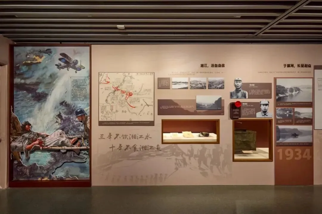 沿着展线进入“江河·奔腾的意志”板块,血战湘江的悲壮一幕在叙事中缓缓展开。1934年11月,中央红军在广西湘江一线,与敌军展开长征途中最为惨烈的战役。面对数十万敌军的重兵封锁,红军将士浴血奋战,几万名战士血染湘江,中央红军由出发时的8.6万余人锐减至3万余人。“三年不饮湘江水,十年不食湘江鱼”,湘江之畔,写满了悲壮与牺牲。