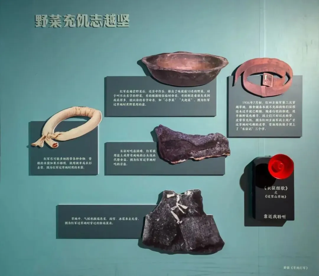 在展厅中,一些看似寻常的物件——草鞋、旧布、军装——却承载着难以想象的生命重量。在那片渺无人烟的草地上,战士们挖野菜、煮皮带;在空气稀薄的雪山之巅,有人被冻伤,有人倒在途中再未醒来。
