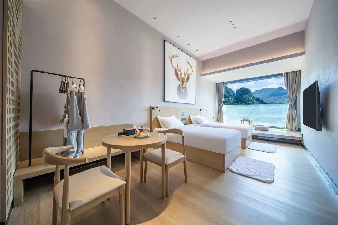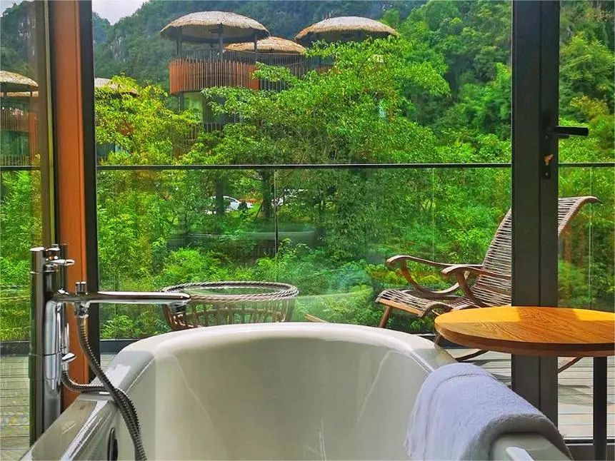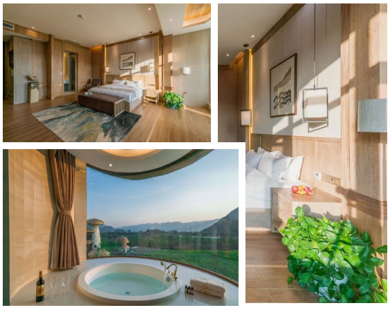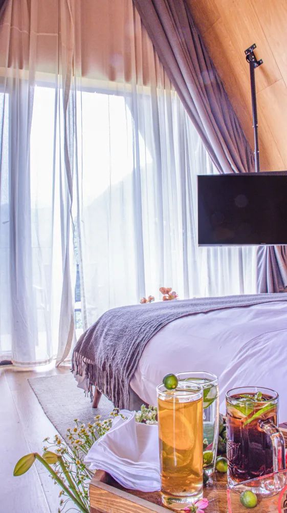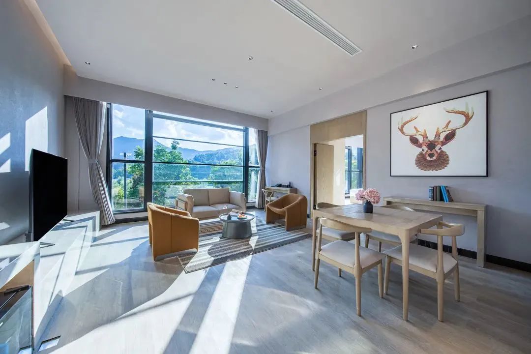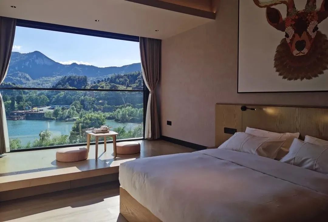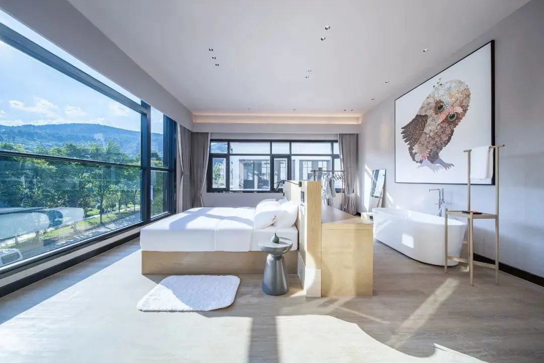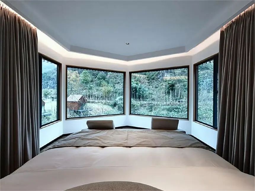 每个房间都坐拥一道独特的风景,180°落地窗环绕,躺在床上就能远眺窗外的美景,给心爱的TA随手一拍都超级出片。
