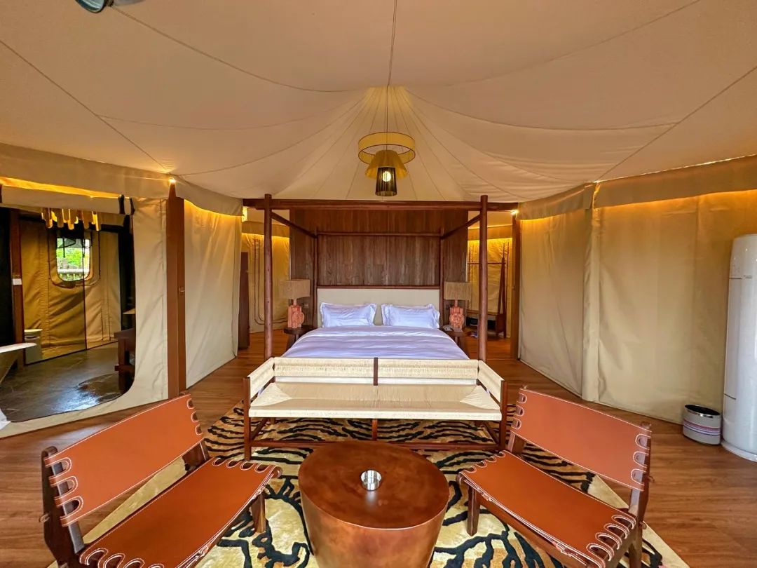 营地目前有帐篷22个,床位38个,配置全胡桃木家具、汉斯格雅卫浴、智能马桶。同时,提供自助营位80个,可在营地租赁帐篷或自带帐篷。