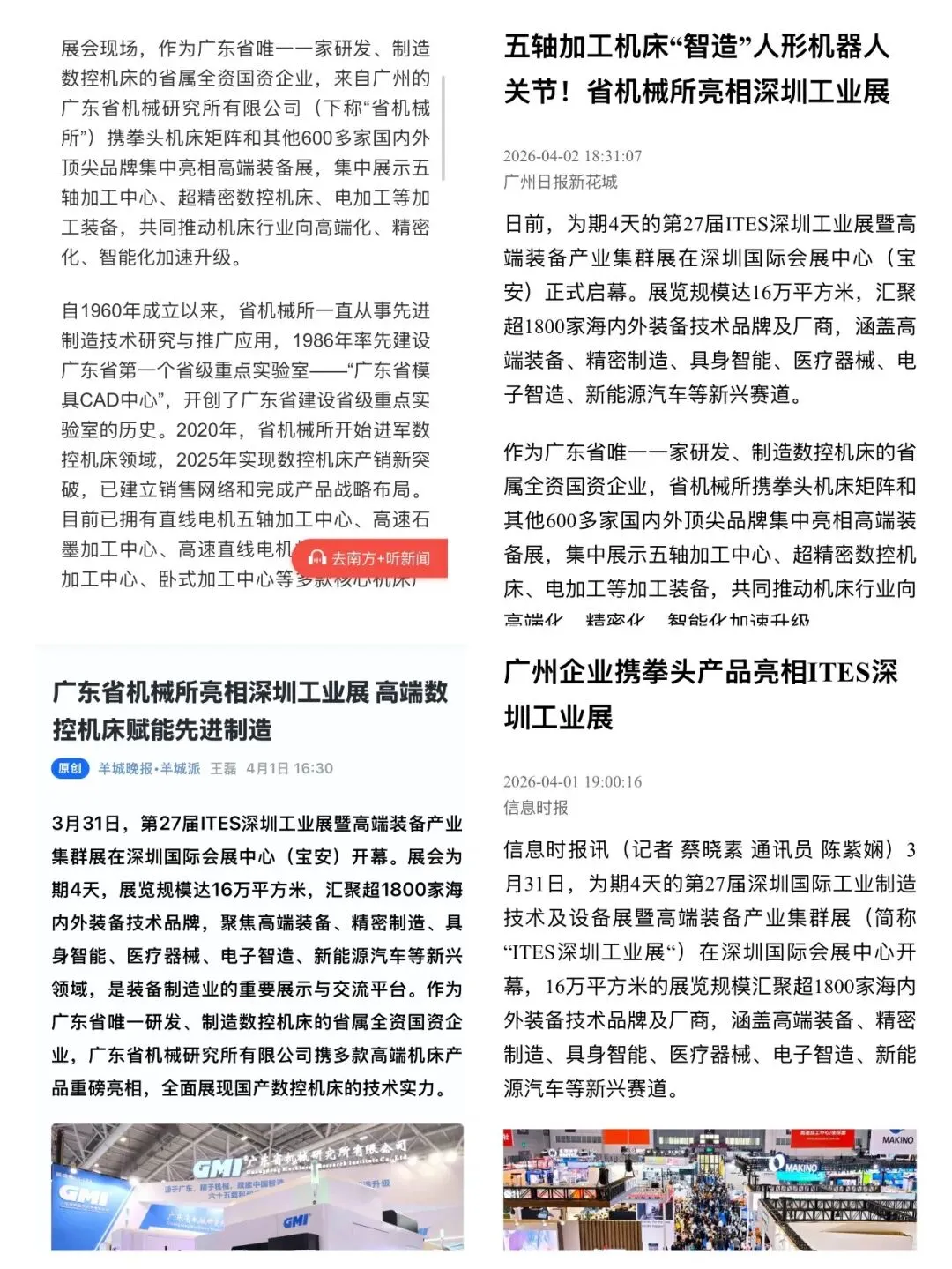 3月31日至4月3日,第27届ITES深圳工业展暨高端装备产业集群展在深圳国际会展中心火热开展。省机械所携多款高端机床产品重磅亮相,全面展现国产数控机床的技术实力。南方日报、广州日报、羊城晚报、信息时报等主流媒体对省机械所参展情况进行了深入报道,并对省机械所机床产品技术实力与业务布局给予高度肯定。