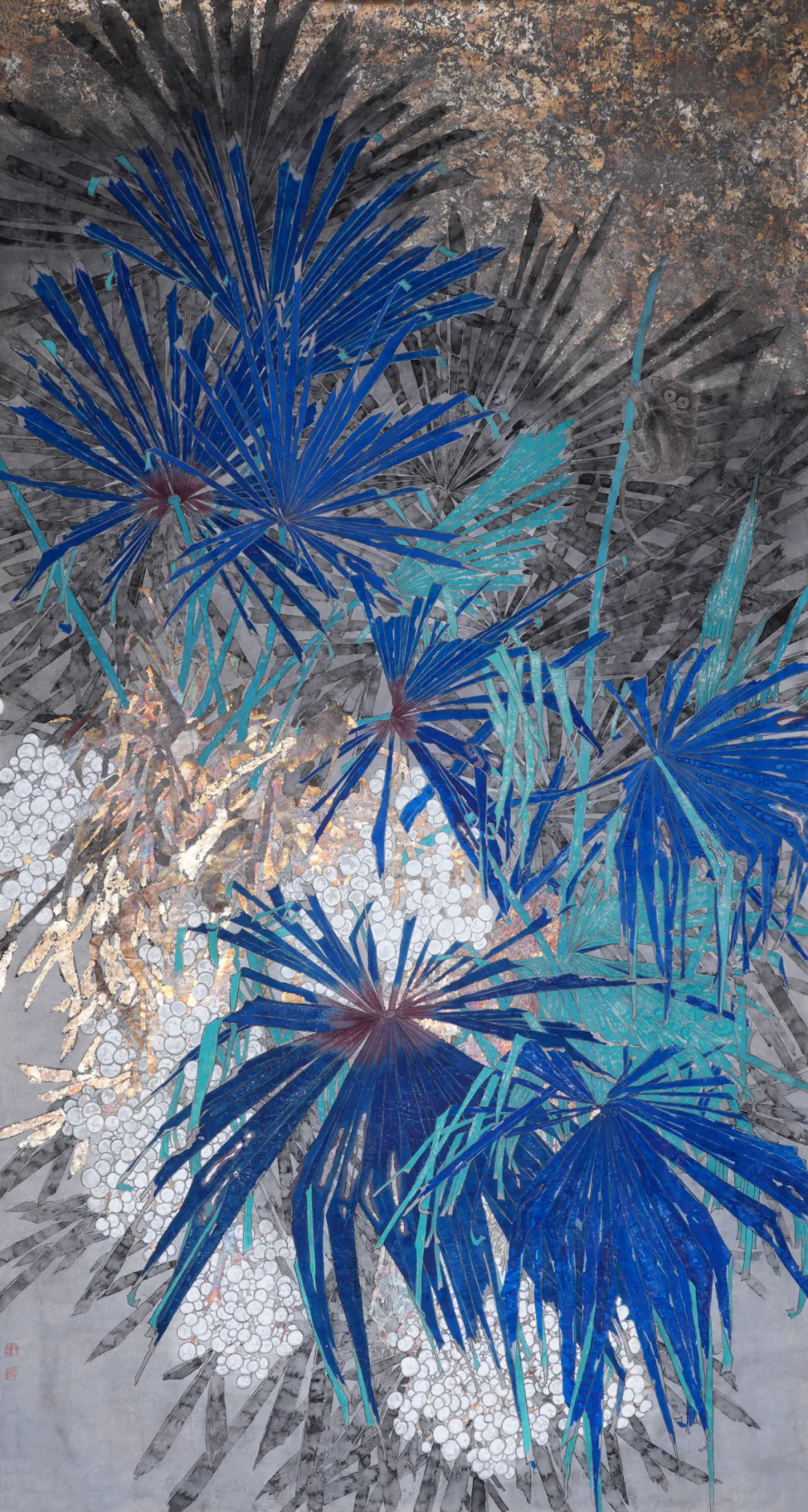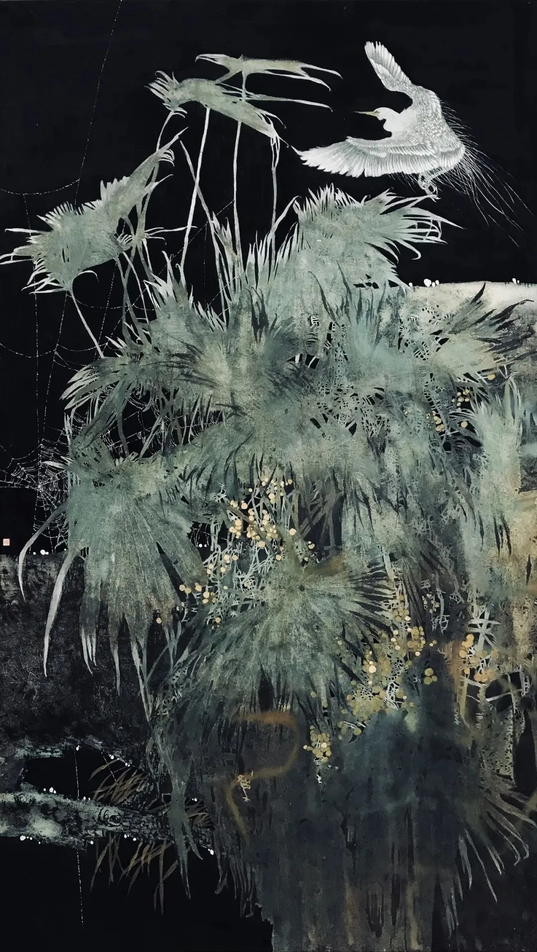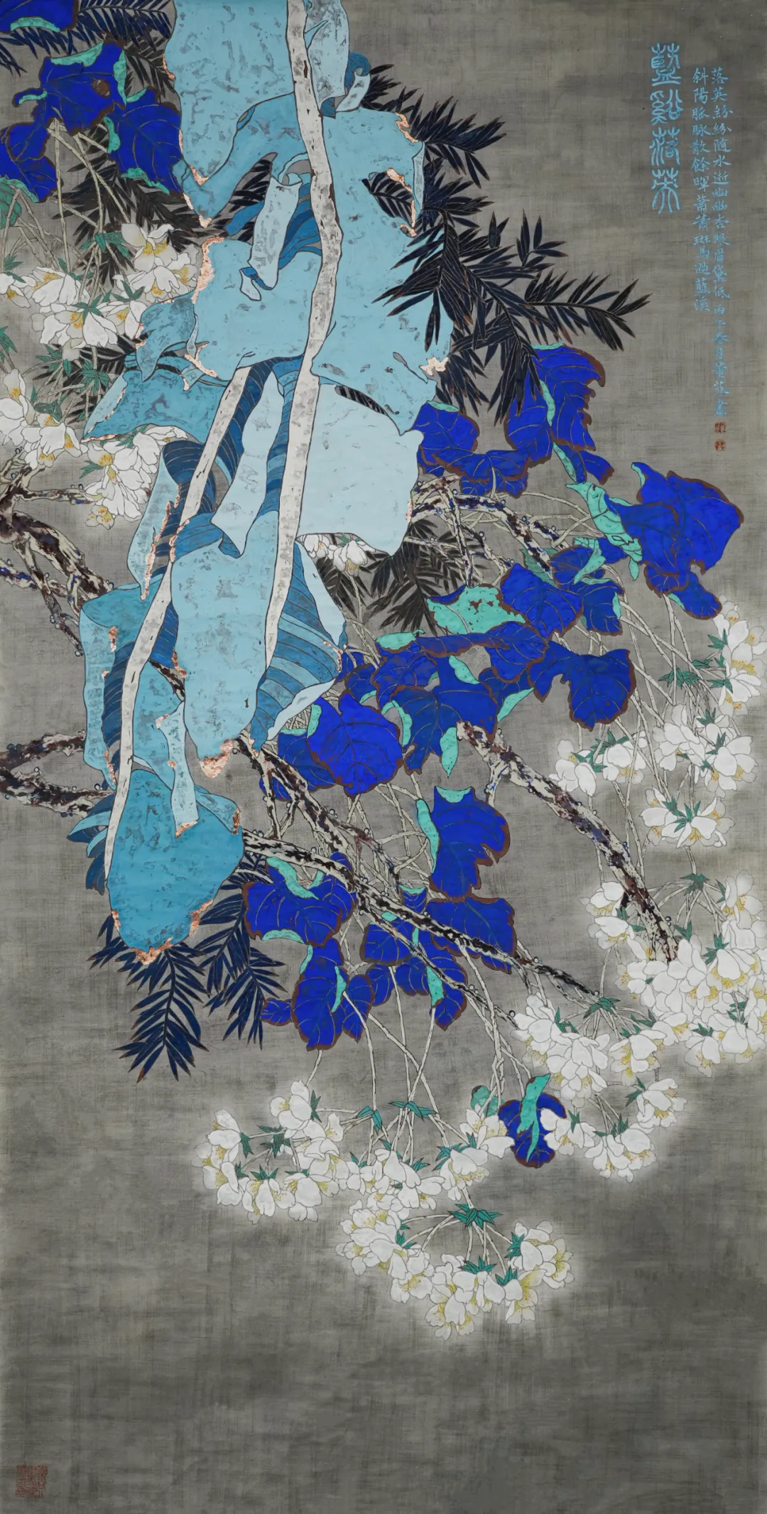 近期的作品中,董菲将工笔、没骨、重彩多方法融合于中国花鸟画的创作之中,坚守中国美学的写意精神,在材料使用与题材表现上多有突破与尝试,始终秉承着由古入新,守正创新,化古为新的创作理念,在一以贯之的艺路历程中展开了崭新的创新之门,亮丽、明快、幽玄、沉厚的艺术之风,初露端倪。