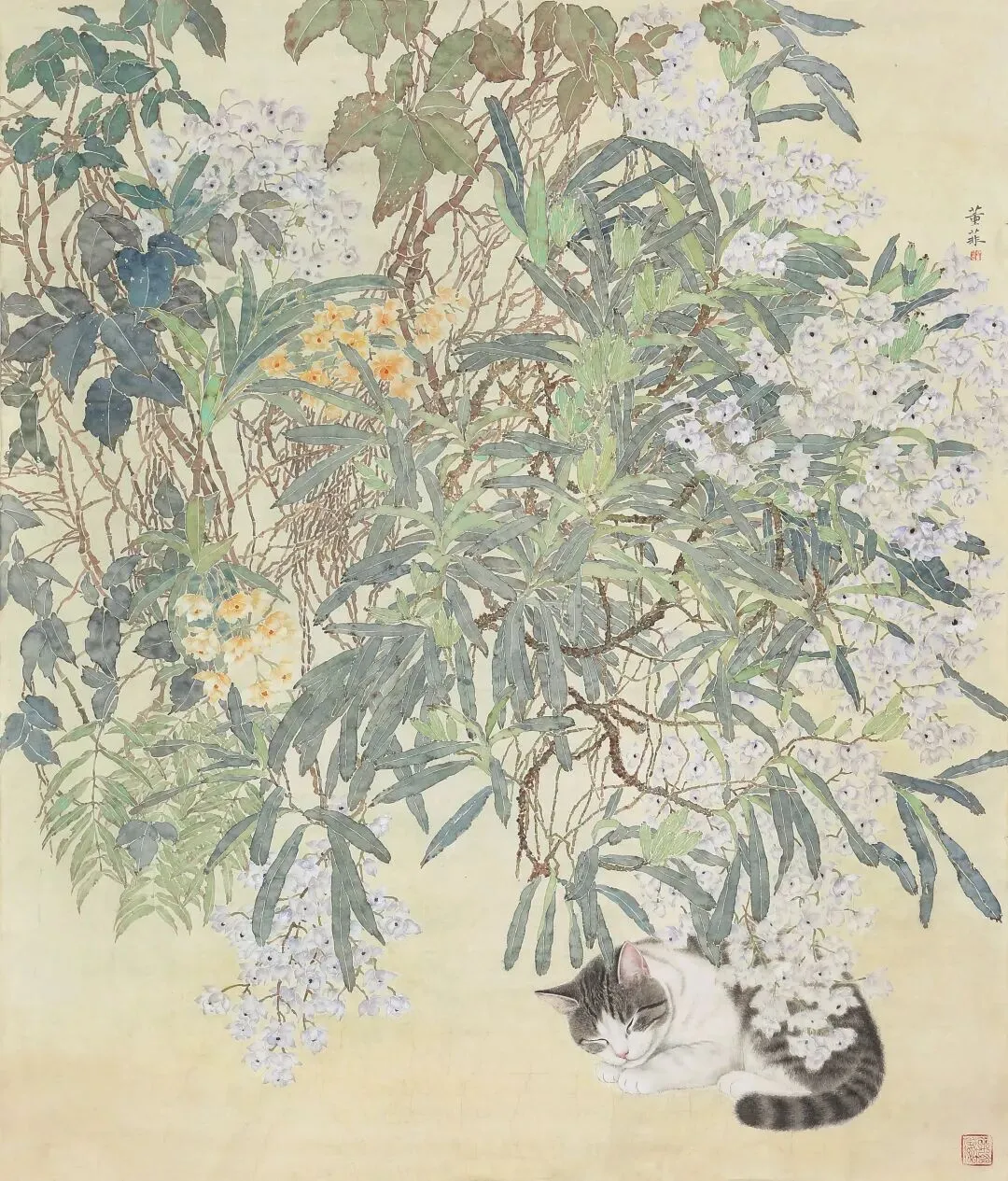 董菲《花影猫憩图》150cm×97cm 纸本设色 2025年