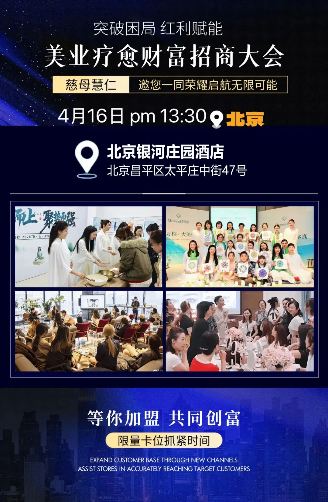 4月16日,疗愈行业财富招商会重磅启幕!聚焦美业+百业+疗愈黄金赛道,融合身体疗愈、心理疗愈、能量疗愈、多元爆款项目,打破传统美业百业经营局限,打造高客单、高复购、高口碑的盈利新模式。