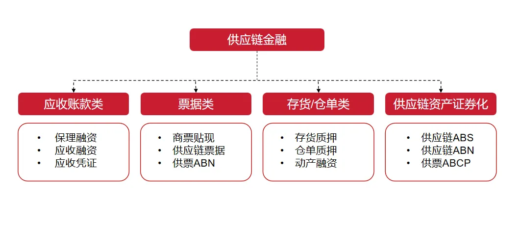 核心企业上下游:供货贷 + 订货贷 + 应收账款融资 + 商票贴现 + 供应链票据 + 反向保理 + 脱核模式融资