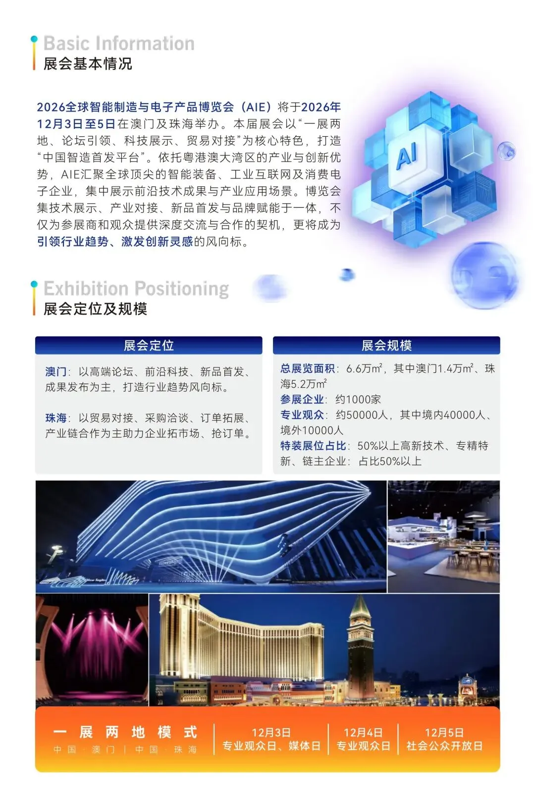 由省商务厅,省科技厅,省贸促会指导,广东潮域展览有限公司主办的2026全球智能制造与电子产品博览会(AIE)将于2026年12月3日至5日在澳门及珠海举办。