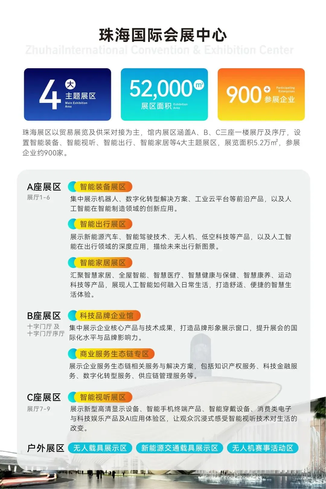 本次展会以"一展两地、论坛引领、科技展示、贸易对接"为核心特色,澳门以论坛活动和科技展示为主,设置展示区、体验区、创客区、活动区等4个功能板块。珠海以贸易展览和供采对接为主,设置智能装备、智能视听、智能出行、智能家居等4大主题展区。