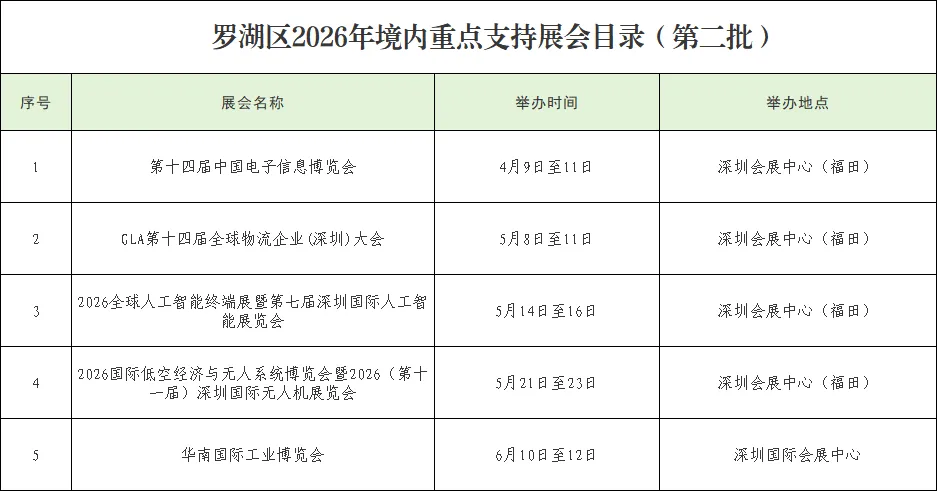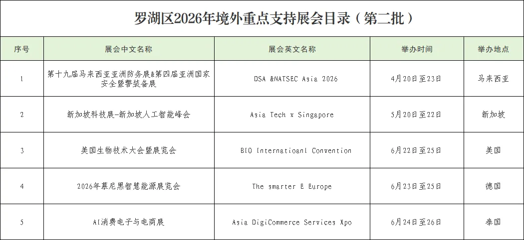 展会是企业展示品牌形象和产品实力的重要平台,参展是企业开拓市场的重要途径。为进一步帮助企业巩固传统市场、拓展新兴市场,罗湖区将部分境内外大型展会纳入2026年重点支持展会目录,旨在通过政府带团、协会组团、企业抱团等形式,支持企业积极参展拓市场、找订单,助力罗湖区推进产业转型升级、实现高质量发展。