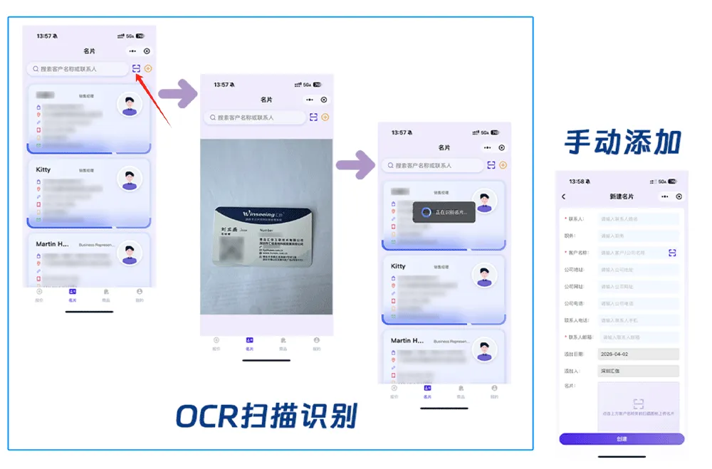 客户信息一键录入,扫描客户名片就能自动识别姓名、公司、联系方式等信息,无需手动输入,