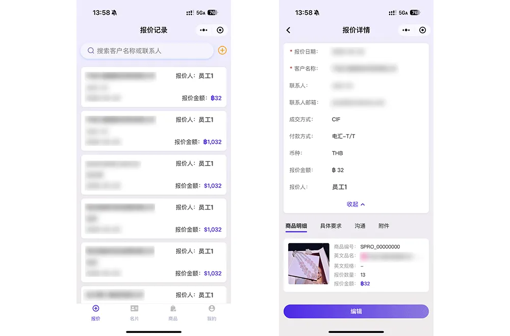 业务员现场对接客户的需求、报价记录,可实时同步给公司后台,老板、运维人员可远程查看,及时提供支持,比如调整价格、补充产品资料,让谈单更有底气;