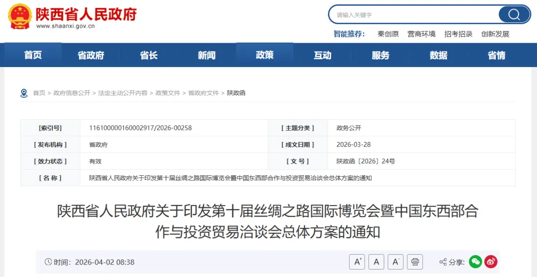 经商务部批准,第十届丝绸之路国际博览会暨中国东西部合作与投资贸易洽谈会将于2026年5月21日至25日在西安市举办。现将《第十届丝绸之路国际博览会暨中国东西部合作与投资贸易洽谈会总体方案》(简称《总体方案》)印发给你们,请按照《总体方案》有关安排,结合实际,积极参与投资贸易活动,开展招商引资工作,节俭、务实、高效、安全办好第十届丝博会。