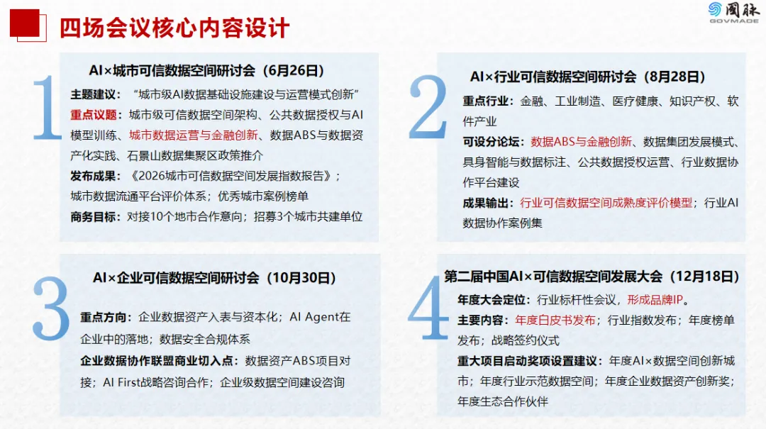 2026年AI×可信数据空间系列会议将突破单一会议模式,打造“系列化、品牌化、商业化、生态化”的会议矩阵,实现从“会议活动”向“产业运营抓手”的升级,构建五大核心平台,即政策发布平台、行业研究平台、生态协作平台、商务合作平台和招商引资平台,最终形成从城市到行业、从企业到全国的影响力闭环,助力可信数据空间建设落地见效。