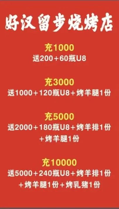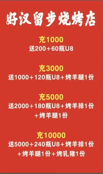 充10000送5000+240瓶U8+烤羊排1份+烤羊腿1份+烤乳猪1份