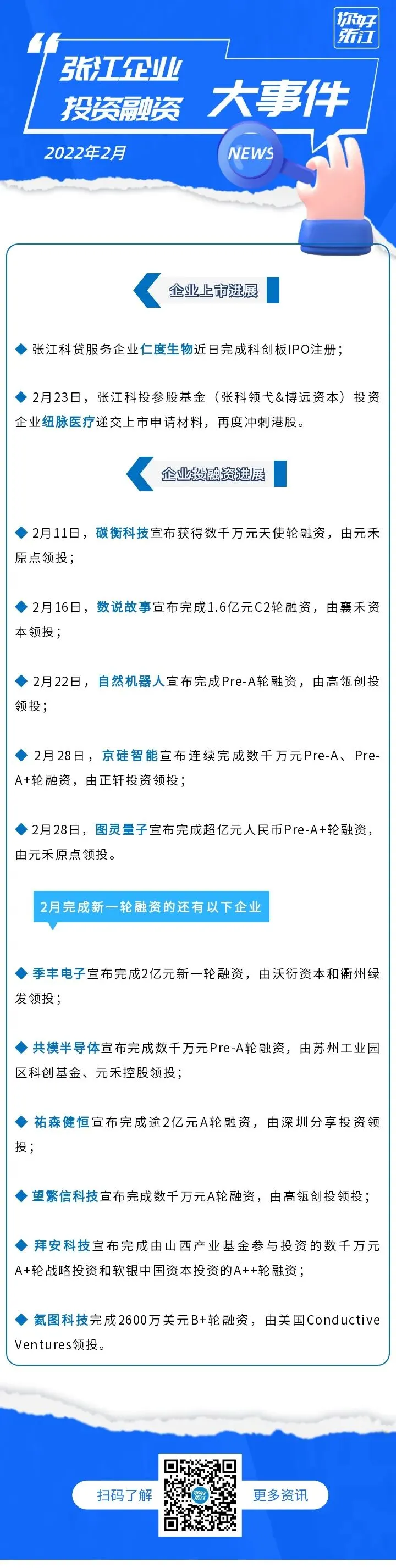 2022年起,“你好张江”推出“张江投融资月报”栏目,回顾张江企业的上市进展和投融资动态,展现张江的科创活力。