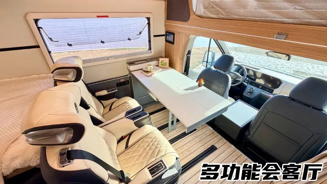 临时会客厅区域:二排航空座椅配备通风、加热功能,长途乘坐也不易疲惫;座椅前方的升降折叠桌,展开可用、收起可藏,尺寸可变,不占用多余空间,搭配前方翻折小板凳与一键电控升降扶手盒即可轻松实现四人对座会客厅。