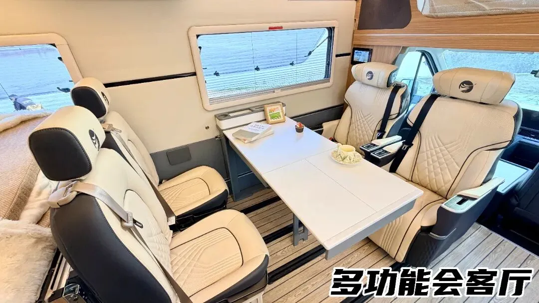 驻车时,二排座椅可180度旋转,与三排座椅形成四人对坐模式,搭配侧滑至中间的桌子,瞬间变身宽敞会客厅,轻松满足5-6人休闲娱乐、聚餐畅谈的需求。