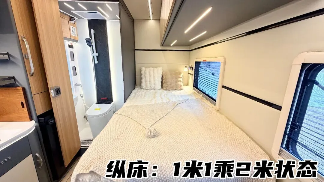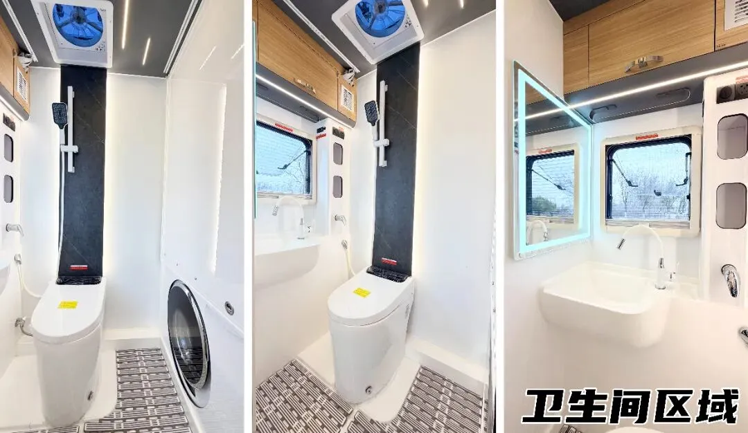 后方卫生间采用抽拉+折叠门设计,展开后空间可达90×120cm,即使两人同时使用也不拥挤;内部配备智能粉碎马桶、一体成型洗手盆、淋浴花洒,搭配充足储物空间与双向雨感换气天窗,洗漱、沐浴舒适又便捷,彻底解决户外旅居的洗漱难题。