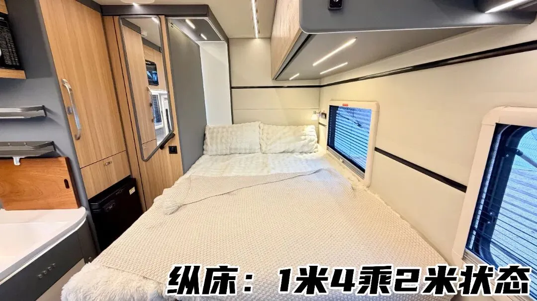 睡卧区域精心设计,兼顾实用性与舒适性:后方扩展固定纵床,常规尺寸1.1×2m,拓展后可扩大至1.4×2m,一人睡空间奢侈,两人睡宽敞舒适。