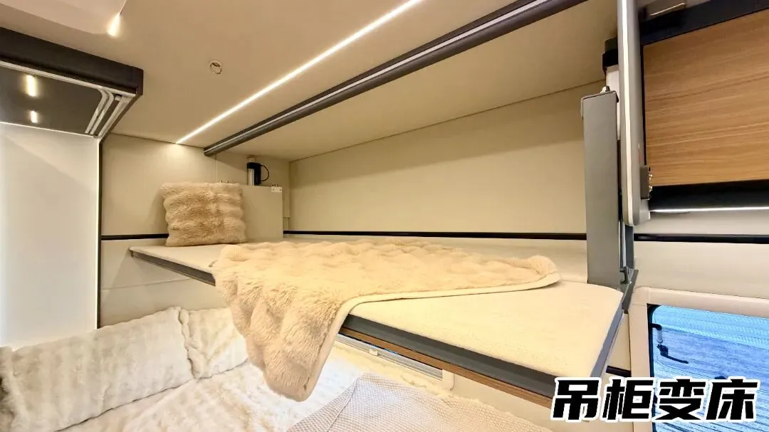 固定床上方的多功能吊柜内置升降电机,可收纳大量衣物被褥,兼顾储物与空间整洁,还可切换为0.95×2m单人床,灵活适配不同人数休息需求。