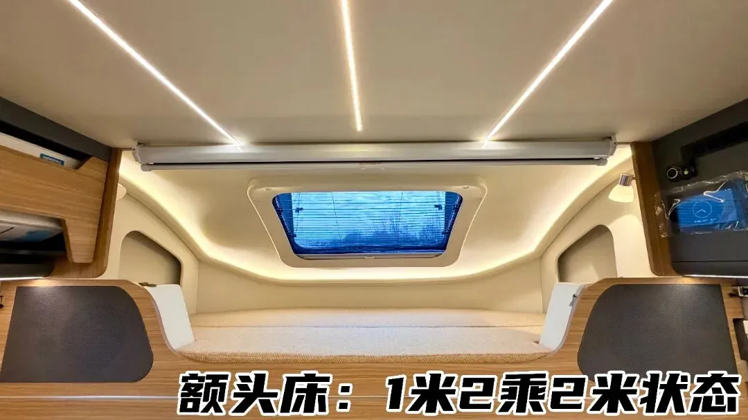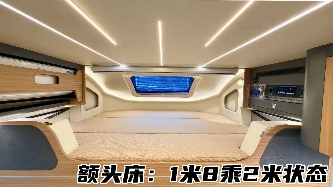 驾驶室上方的抽拉式额头床更是亮点,抽拉前1.2×2m、抽拉后1.8×2m,搭配上方观景天窗,休息时也能沐浴自然光线、欣赏户外风景,把星光与晨光搬进车里。