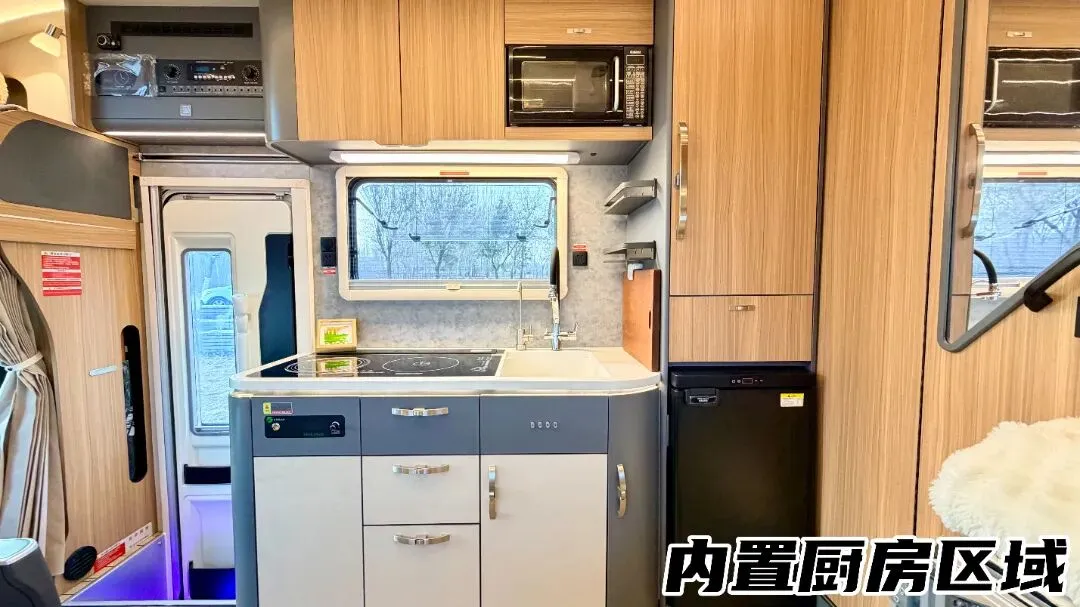 内置厨房空间宽敞,延长板打开即可得到2米多的台面,3-4人同时做饭不成问题;台面上双电磁炉,满足多种烹饪方式,搭配可升降抽油烟机,使用时升起、不用时隐藏,保持车内整洁;上方为蒸烤一体机,做个简餐热个牛奶超方便,旁边76L冷藏冷冻可调节冰箱,轻松存放瓜果蔬菜。